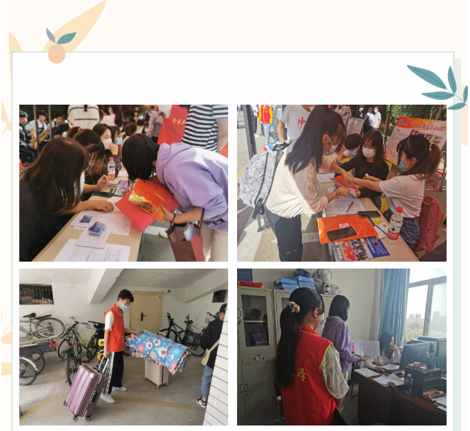 2021级新生陆续到来,在迎新过程中学院为新员工们做了全方位的准备——志愿者们、预备党员们早早地布置好注册接待点,分工明确,各司其职。新生陆续抵达文萃校区东门,通过校园验证测温通道进入校园,并沿指示牌在迎新志愿者的指引下到达迎新工作台。学长学姐们热情地接待每一位到来的新生,核验录取通知书,收取健康卡及核酸报告,落实疫情防控措施,并向新生发放校园卡、《学生手册》、《校园安全防范知识》等入学材料。由志愿者帮助新生搬运行李,带他们进行注册,报名登记、领取钥匙,入住宿舍。