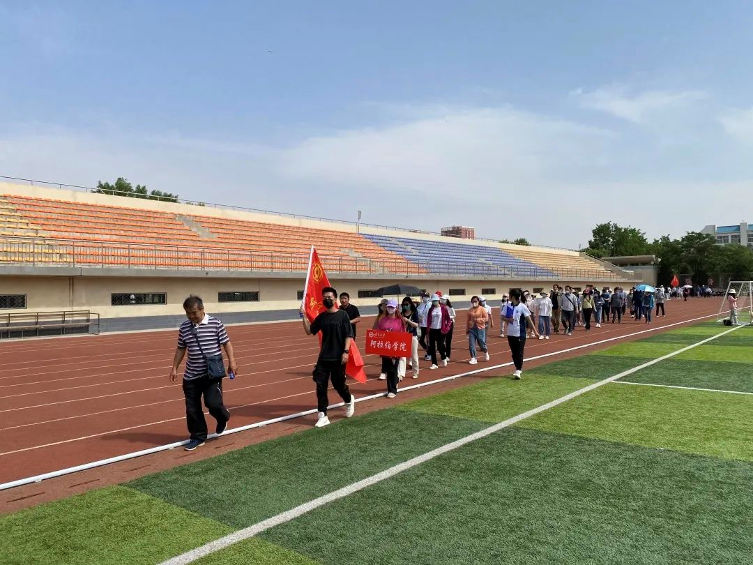 五月,春未尽,夏初临,金波湖波光粼粼。活动过程中,教职工环绕金波湖、凌云广场、b区操场和篮球场等区域进行健步走活动。全体队员迈着矫健的步伐,行进中高喊“阿院健步,勇争第一”口号,精神抖擞,斗志昂扬。