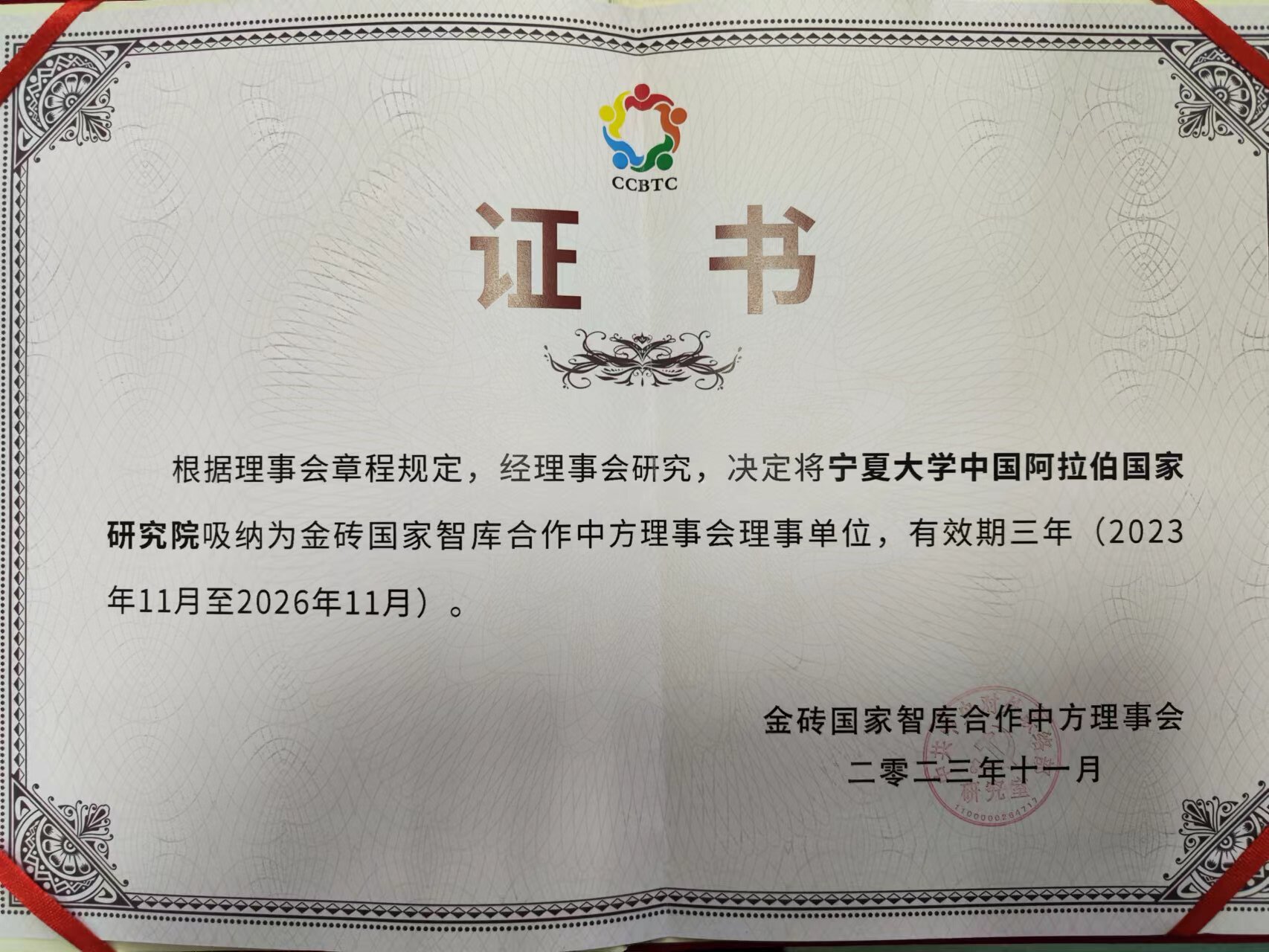 中国阿拉伯国家研究院成为新一届金砖国家智库合作中方理事会理事单位。中国阿拉伯国家研究院书记冯璐璐、副院长冯燚参加此次会议。金砖国家智库合作中方理事会于2017年成立,中共中央对外联络部是金砖国家智库合作的牵头单位,理事单位来自国内高校、研究机构以及企事业单位,主要负责并参与金砖国家合作框架下的学术和智库对话交流与合作,是一种开放的工作机制和平台,研究方向覆盖了政治安全、贸易金融、教育文化、医药卫生、网络科技等金砖国家合作涉及的主要领域。