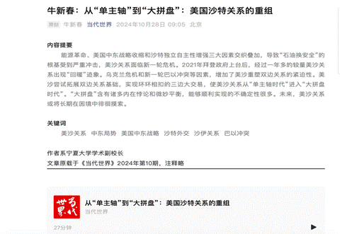 三、10月28日在《当代世界》杂志发表题为《从“单主轴”到“大拼盘”:美国沙特关系的重组》的文章