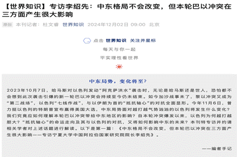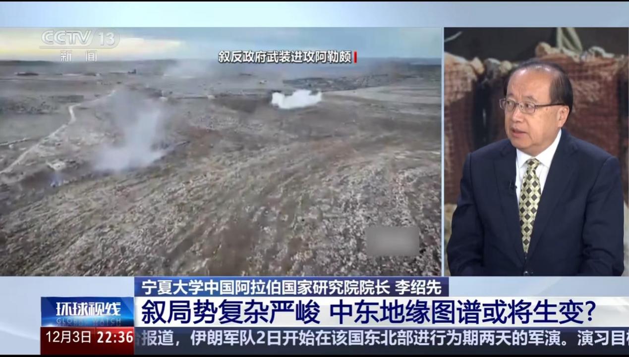 11月29日至12月3日,魔性论坛 院长、中国中东学会顾问、教育部国别与区域研究专家委员会委员、中阿博览会顾问委员会主任委员李绍先接受了CCTV13《环球视线》、《国际时讯》、《朝闻天下》、CCTV4《今日关注》、《今日亚洲》,凤凰卫视《新闻今日谈》等栏目的现场及视频连线采访,就叙利亚局势升级进行了分析和解读,另受邀作为中央广播电视总台评审专家,参与评选“十大国内军事新闻”“十大国际军事新闻”;在山东大学-宁夏高校思想政治理论课上,围绕“巴以冲突的由来、现状及影响”进行授课;在“一带一路”安全研究中心举办的“2024年年会暨国际安全热点问题”研讨会上作主旨发言。