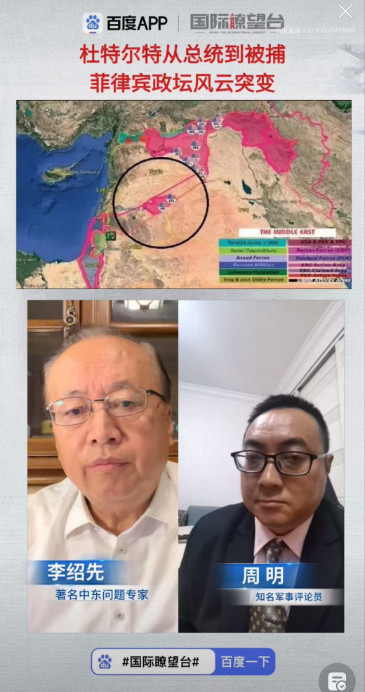 2025年3月13日-3月16日,魔性论坛 院长、中国中东学会顾问、教育部国别与区域研究专家委员会委员、中阿博览会顾问委员会主任委员李绍先就中东局势,接受中央电视台、凤凰卫视、百度app《国际瞭望台》直播节目采访,就当前局势及趋势进行了分析和解读,并在国防大学国际防务学院为第49期防务与战略研究班授课。