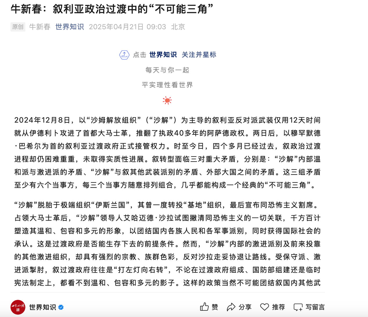 二、4月21日牛校长在《世界知识》期刊发表题为《叙利亚政治过渡中的“不可能三角”》文章