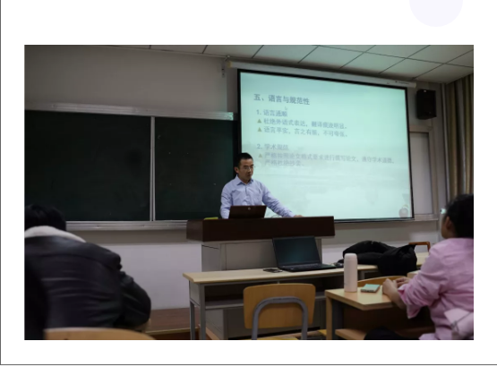 接着,宋保军老师细致地分享了毕业论文的写作经验。他指出,论文选题是核心,文献材料是基石,还要注意论文的结构和逻辑性,理论方法要创新且具有深度。他带领在座同学深入探讨了论文语言与规范性,他就语言文字规范、标点符号和数字规范、参考文献的格式规范对论文写作的规范提出了具体的要求,在座师生受益良多。