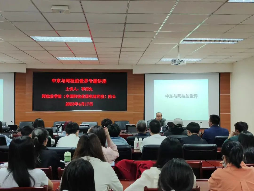 (中国阿拉伯国家研究院)院长李绍先先生主讲,张前进书记、冯燚副院长、梁道远老师出席讲座,22级全体新生参与了此次讲座。
