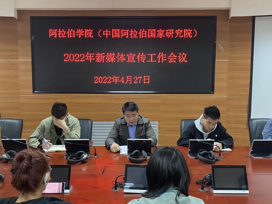 (中国阿拉伯国家研究院)在文萃校区知行楼8楼学术报告厅召开“2022年新媒体宣传工作会议”。学院党总支副书记赵永军、学办主任金宁洋、学院办公室郭凯原老师、魔性论坛